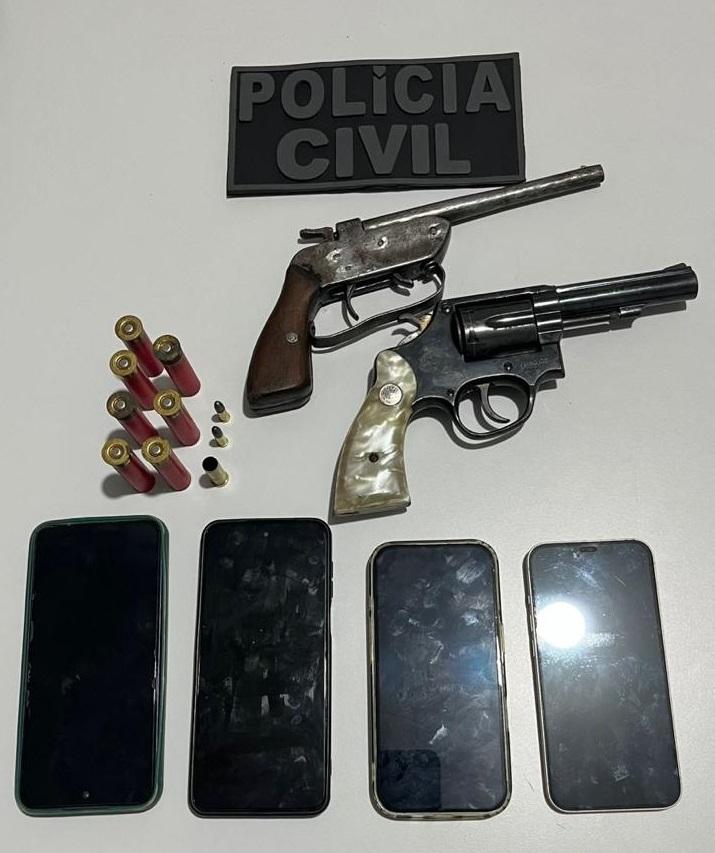 Ao todo, foram apreendidas duas armas de fogo (calibres 38 e 22), munições diversas, quatro aparelhos celulares, além de uma motocicleta utilizada na prática dos crimes.