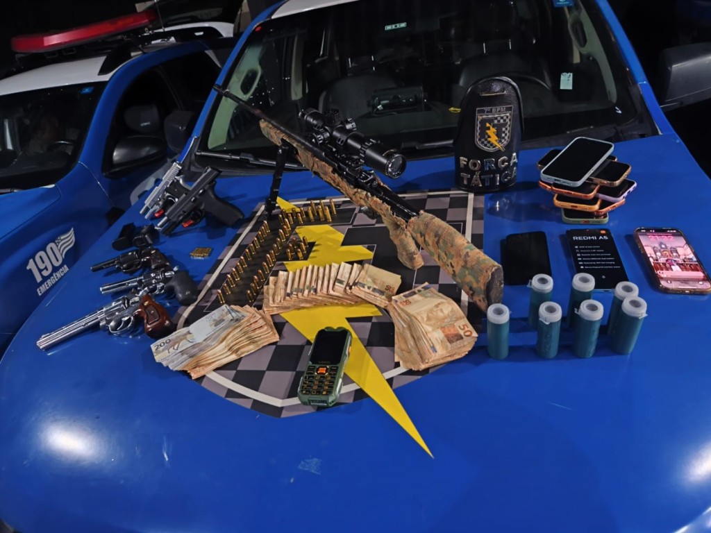 Na ação, foram apreendidas seis armas de fogo, sendo cinco armas de porte e um fuzil calibre 7,62, além de expressiva quantidade de dinheiro em espécie. Ao todo, seis pessoas foram presas e todo o material bélico e os valores apreendidos foram apresentados à autoridade policial competente.